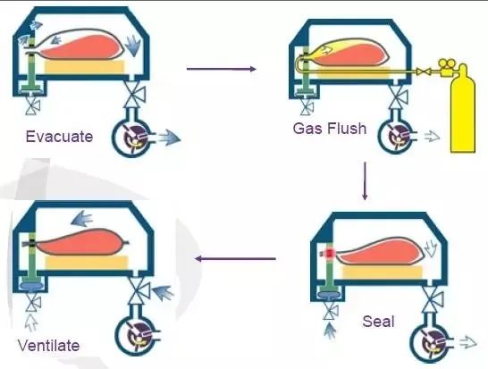 在肉类气调保鲜包装中,使用高浓度O2可使鲜肉保持鲜红色更鲜艳,在缺氧环境下则肉质呈淡紫色,如用CO2、N2等保鲜气体,肉色泽呈淡紫色,保鲜期可达30天左右。生鲜肉类包装材料也要求使用对气体有高阻隔性的复合塑料包装材料。